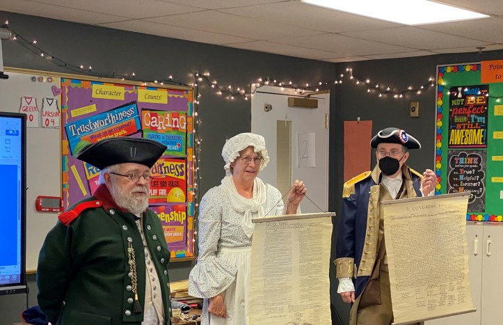 On Saint Patrick’s day, Rich Howey and Chris Moberg of the MN SAR along with Gigi Hickey of the MN DAR gave a 90 minute presentation of our Patriot Chest to the combined 4th grade classes of Maranatha Christian Academy in Brooklyn Park, MN. We talked about the history of the Revolutionary period, how the revolution came to be, flags that were used during the revolution, major historical documents of the period, period clothing, household goods, the life of children at that time, etc.