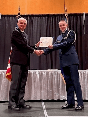 Compatriot Michael Stainbrook, Sr. & SAR Silver ROTC Medal winner, Cadet Levi Schick – University of Minnesota Duluth Air Force ROTC Awards Ceremony 16 April 2023.